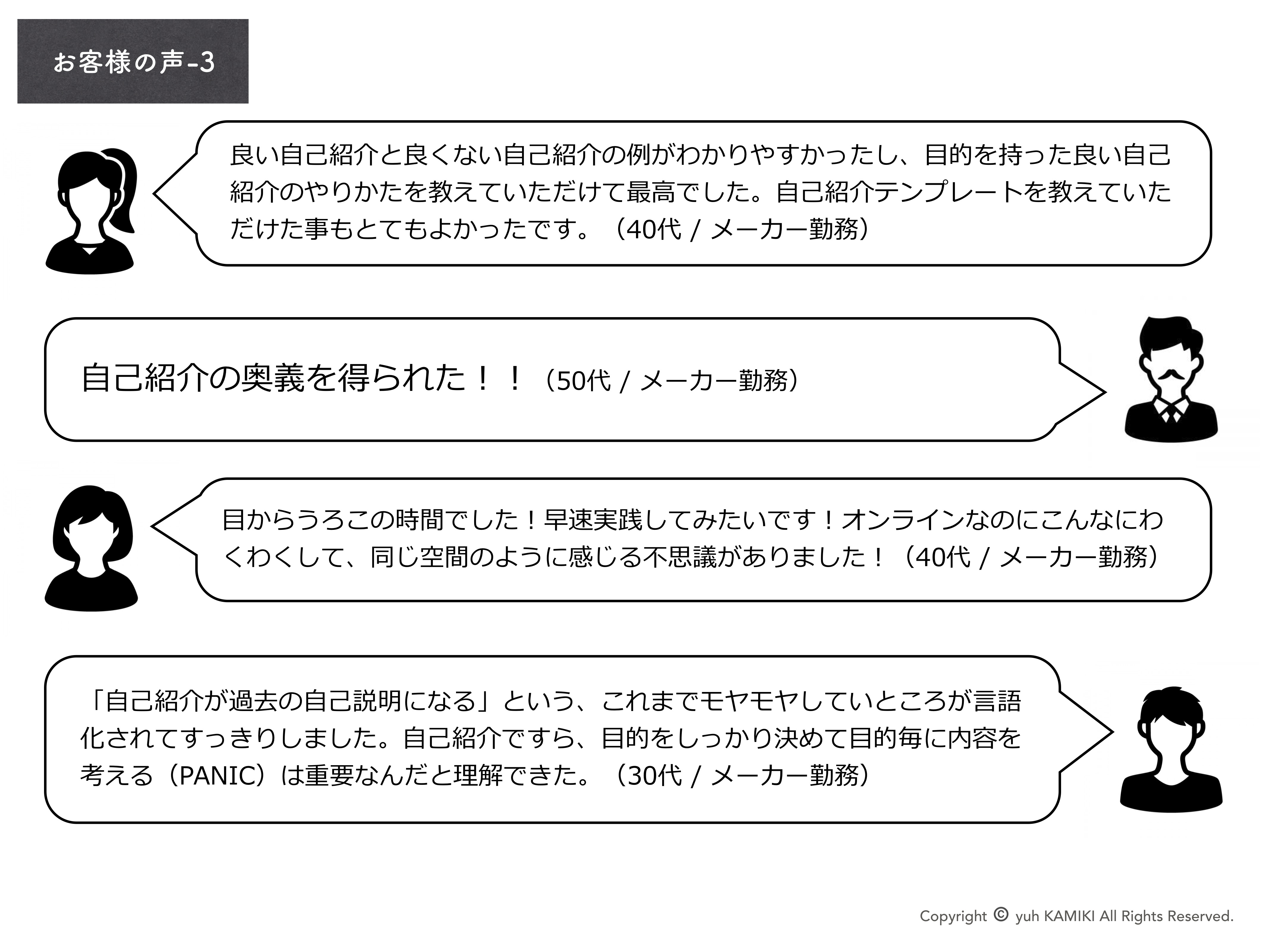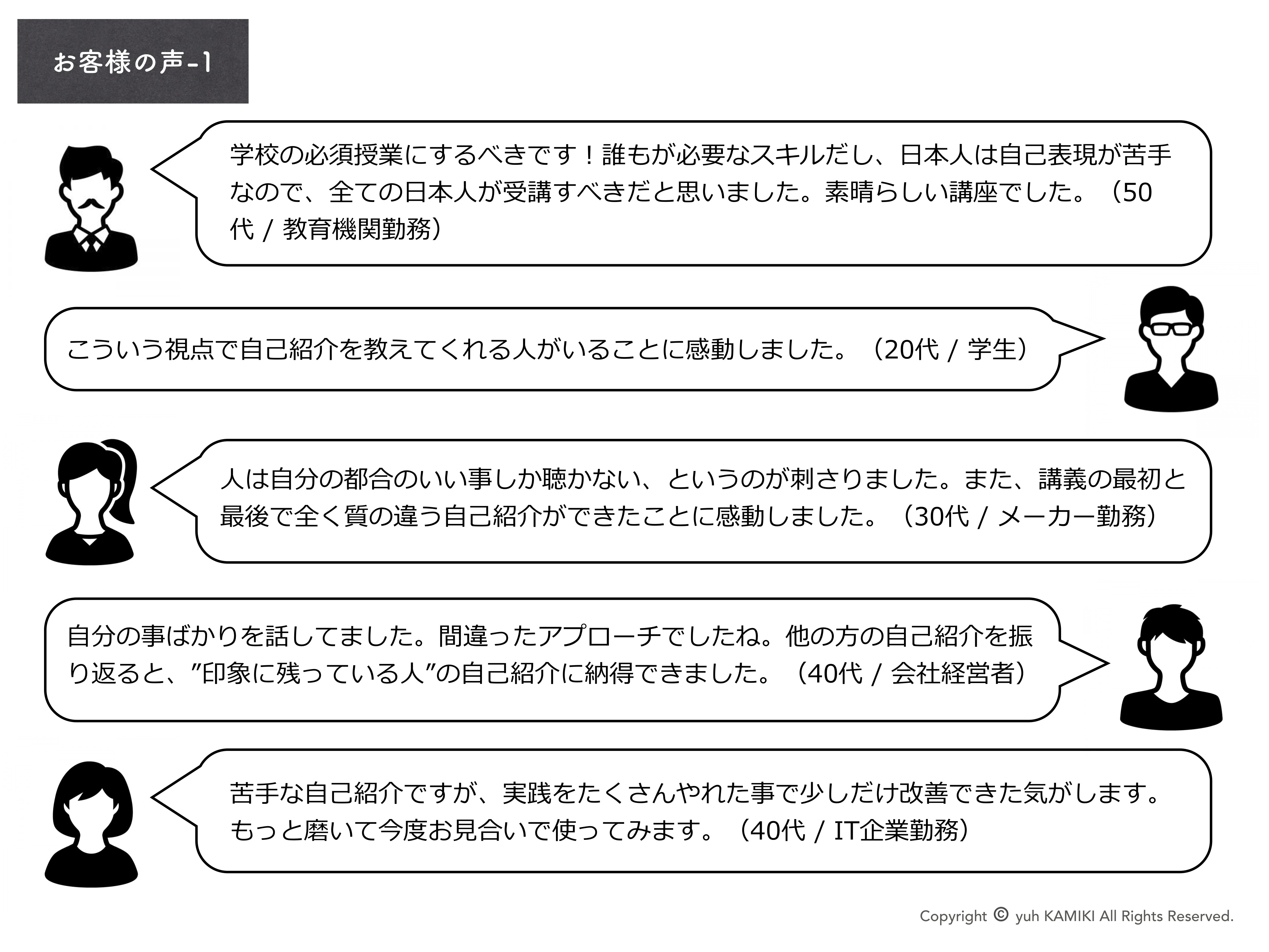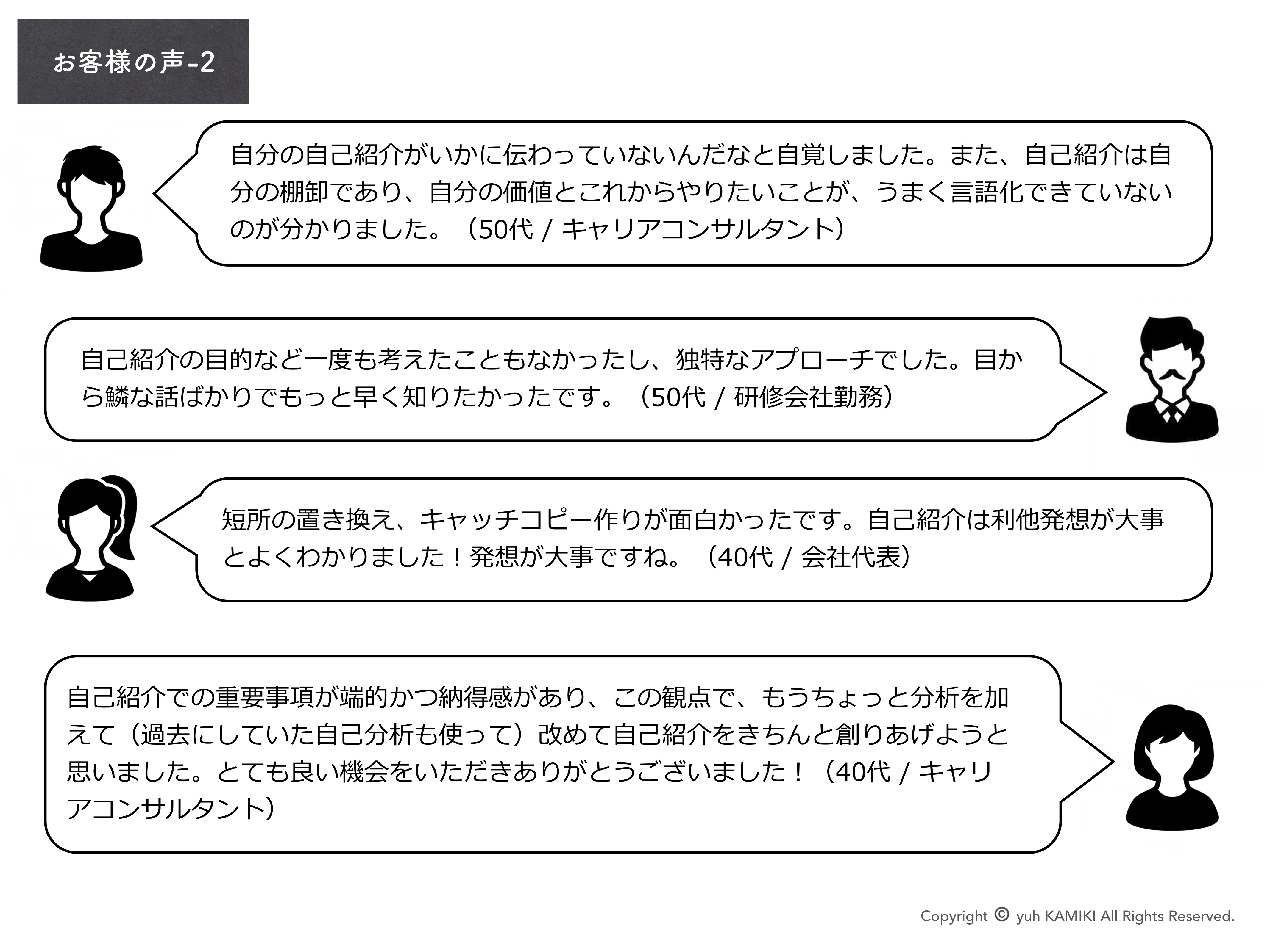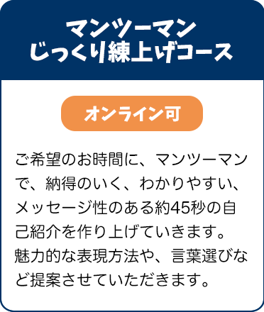 ご希望のお時間に、マンツーマンで納得のいく、わかりやすい、メッセージ性のある自己紹介を作り上げていきます。